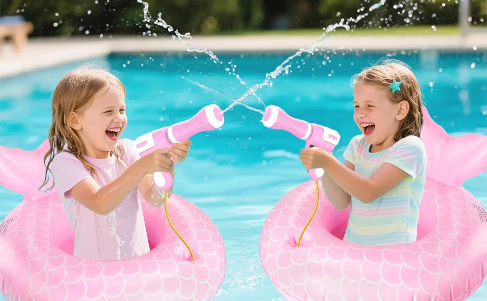 • High-Quality Materials: To ensure the safety and health of children, our mermaid kids floaties with water gun is made of premium eco-friendly PVC material—non-toxic, durable, and tear-resistant. Equipped with a double-lock air valve to prevent leaks, pool float with water gun provide secure and worry-free water play for kids